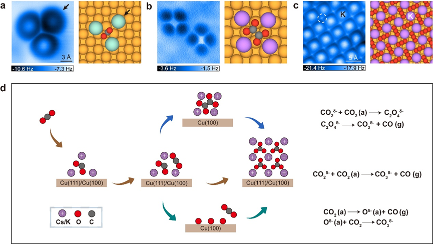 1 铜表面上碱金属阳离子聚集诱导CO2的高效活化和转化。(a-c)碱金属离子与关键中间体配位结构(3Cs+∙CO2δ- (a), 4K+∙C2O42- (b), KCO3 (c))的高分辨AFM图和结构模型图;(d)反应机理示意图。