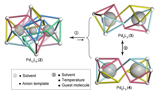 自然界中许多大分子如蛋白质、DNA、RNA等可通过刺激响应性的结构或构型转化来实现其生物功能。利用配位键的动态性,化学家可以在配位超分子组装体系中仿生模拟这种结构转化和功能过程。组分、溶剂、浓度、温度、客体结合、阴离子模板和后修饰等多种外部刺激条件均可调控配位组装体系的结构转化。同时,“纳米容器”型超分子组装体在刺激响应性结构转化过程往往伴随着分子尺寸、形状、空腔及窗口的亲疏水特性等变化,使得这类具有可逆转化的超分子主体开发具有重要的研究意义。