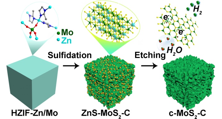 在前期研究的基础上,张健研究员等人和阿卜杜拉国王科技大学张华彬教授合作将HZIFs作为前驱体,通过直接硫化和酸刻蚀策略,制备得到了碳支撑的、基面撕裂并且垂直分布的二硫化钼纳米片(c-MoS2-C)。基于同步辐射技术和理论计算分析,MoS2基面的撕裂暴露出了更多的不饱和Mo边缘位点,极大的增加了MoS2基面电荷的极化,并且有利于H原子的吸附/脱附。于此同时,MoS2的电传导性能也得到了明显的提高。该方法不仅适用于表层MoS2基面原子的激活,对内层MoS2同样适用。电化学测试表明,c-MoS2-C的析氢活性,动力学以及稳定性得到明显的改善。改工作拓展了MoS2基面激活的策略,与传统的电子/等离子体辐射、化学刻蚀、电化学还原等方法相比较,HZIFs辅助策略具有能耗小,效率高,安全性好等特点。
