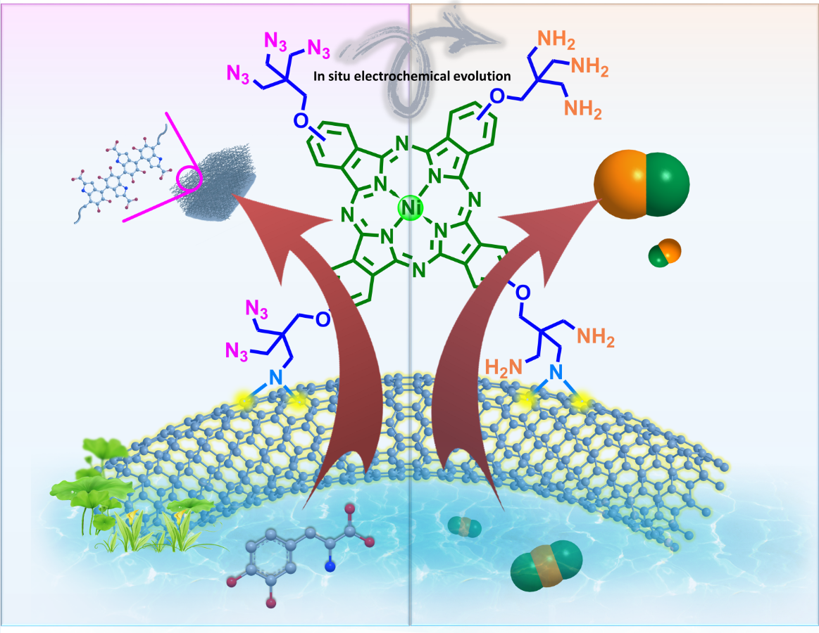 鉴于此,在国家自然科学基金项目等项目的资助下,中科院福建物构所结构化学国家重点实验室朱起龙课题组设计并合成了一种含12个叠氮基团的新型镍酞菁(N3NiPc)分子材料,并用于构筑单分子异质结型双功能电催化剂,实现了阴极CO2还原和阳极氧化纳米聚合的优异性能与高效集成。由于N3NiPc独特的分子结构,通过强π-π堆积、电荷转移作用以及共价键合作用,可以有效地将N3NiPc以单分子形式锚定在碳纳米管(CNT)表面,实现了高稳定的单分子异质结电催化剂的构建。