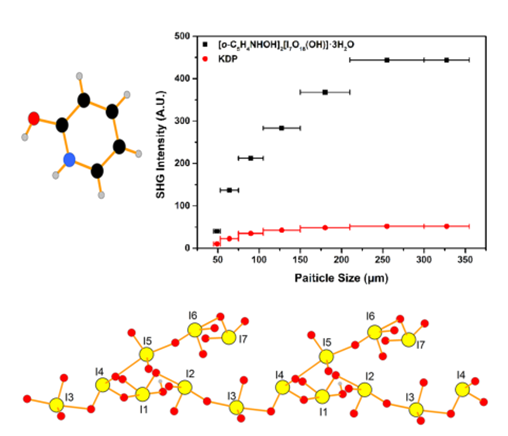 [o-C5H4NHOH]2[I7O18(OH)]·3H2O结晶于Ia空间群,结构中具有独特的[I7O18(OH)]枝状链。[o-C5H4NHOH]2[I7O18(OH)]·3H2O晶体表现出了优异的倍频性能,其倍频效应是磷酸二氢钾(KDP)的8.5,它同时还具有高的激光损伤阈值(182.34MWcm-2)和宽的带隙(3.9 eV)。理论计算表明[I7O18(OH)]枝状链对倍频效应的贡献率为82.17%。与传统的水热合成相比,常温下利用不对称有机胺和碘酸的反应获得聚碘酸盐NLO晶体条件更为温和。该研究结果有望为碘酸盐NLO晶体的设计合成提供一条简便有效的新策略。相关结果发表在AngewandteChemie International Edition上,文章第一作者为中国科学院大学硕士生陈倩倩。