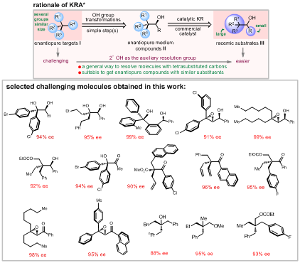 在中科院战略性先导科技专项、国家自然科学基金、福建省自然科学基金的资助下,中科院福建物质结构研究所房新强课题组提出了“基团添加-动力学拆分”的概念,成功解决了多立体中心四氢萘酮的制备和普适性a-官能团酮的拆分两个难点;在此基础上,该课题组进一步提出了“拆分辅基”(KRA*)的策略,成功解决了不对称合成中最具挑战性的含有多个相似取代基的四取代碳中心分子的制备难题,获得了一系列含有多个类似取代基的叔醇、环氧、酯、酮、羟基酮、环氧酮、β-酮酯和甲烷衍生物,而同样的手性分子难以或无法通过其他路径合成出来。所以这一策略可以看做是针对当前直接不对称催化的不足所提出的最佳解决方案。