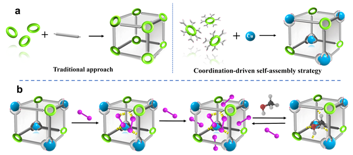 图:铝(III)分子环的可设计组装及碘分子的分步有序捕获:(a) 构筑铝分子环基框架的传统方法与本文配位自组装方法的对比;(b)异金属框架具有丰富的吸附位点,实现了碘分子的分布有序捕获和释放。