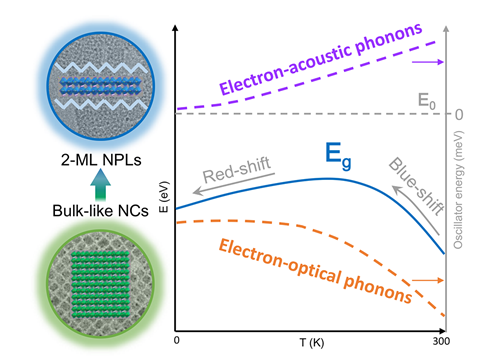 图1、二维CsPbBr3量子片中出现反常的带隙随温度变化特性示意图。