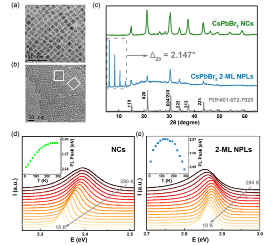 图2、CsPbBr3纳米晶(a)与量子片(b)TEM图;(c)纳米晶与量子片XRD图谱;纳米晶(d)和量子片(e)的变温发射谱及发射峰位随温度变化情况。