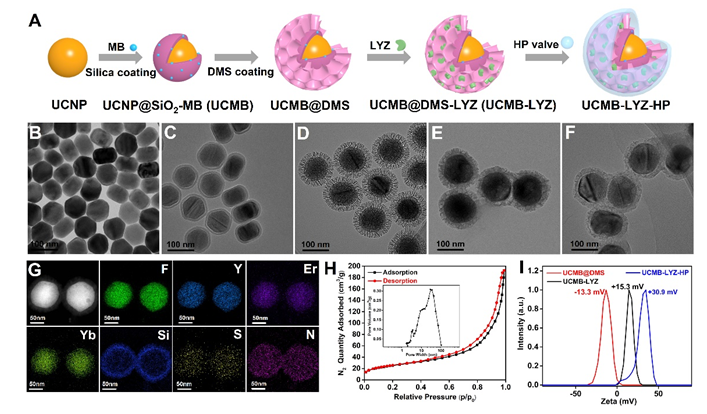 图2:(A)生物-无机杂化纳米材料UCMB-LYZ-HP的合成过程示意图。纳米晶合成、二氧化硅包覆并原位包埋光敏剂、超大介孔二氧化硅包覆、溶菌酶负载以及透明质酸酶响应阀修饰各步骤依次所得样品(B)UCNP、(C)UCMB、(D)UCMB@DMS、(E)UCMB-LYZ和(F)UCMB-LYZ-HP的透射电镜图。(G)UCMB-LYZ-HP的扫描透射电镜图和相应的元素分布。(H)UCMB@DMS的氮气吸脱附曲线和孔径分布图。(H)UCMB@DMS、UCMB-LYZ和UCMB-LYZ-HP的ζ-电势分布图。