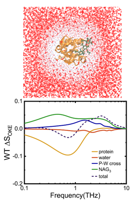 在国家自然科学基金项目和海西研究院两所融合重点项目的资助下,福建物构所结构化学国家重点实验室庄巍课题组与西湖大学黄晶课题组合作,首次发展出基于Drude/MPID统一可极化分子相互作用模型的方法,对水溶液中溶解酶蛋白(lysozyme)-三乙酰壳三糖(NAG3)配体结合体系的太赫兹OKE光谱,及其与无配体(仅有酶蛋白与水)体系信号的差谱进行了精确模拟,并通过拆分差谱信号定量确认了其中酶蛋白,水和配体各自的贡献。进一步的分析表明差谱信号中蛋白的贡献主要来自高极性的芳香残基的结构动力学涨落在配体插入前后的微妙差别。而水的贡献则主要来自配体与蛋白内壁共同锁住的受限水的转动。通过对蛋白突变体(mutant)类似信号的模拟分析及与野生类型(wildtype)信号的比较,本工作揭示了OKE信号对酶-配体结合情况微小变化的高度敏感性 (以往的工作表明圆二色谱和荧光谱等常用技术对这一变化并不敏感)。另外,通过将差谱信号与一个包含不关联的蛋白与配体部分的假想体系信号进行对比,本工作揭示了单纯的蛋白-配体结合活动本身在OKE信号中的显著响应。
