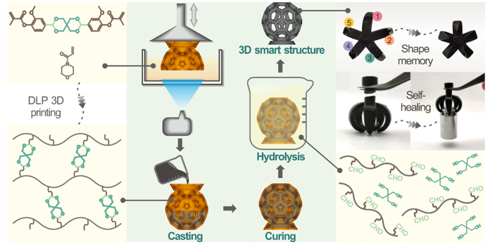 图:光固化3D打印牺牲热固性模具用于构建近红外辐射诱导自修复3D智能结构
