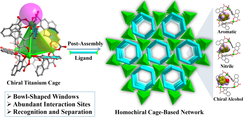 图1. 通过后组装修饰策略构建手性Ti4L6笼基框架材料应用于分子异构体识别与分离。