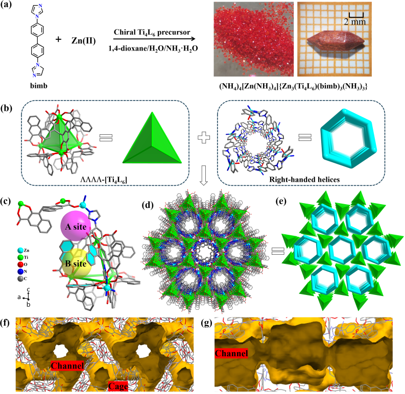 图2. 合成路线及相关晶体结构图。手性Ti4L6笼的作用位点:A点,未配位的裸露羧基氧原子;B点,萘环基团。