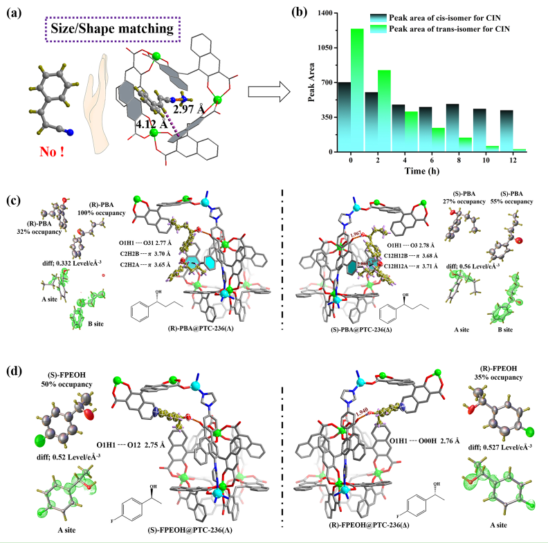 图3. (a, b) 对肉桂腈顺反异构体的选择性识别和拆分;(c, d) 对手性芳香醇对映体的选择性识别与封装。