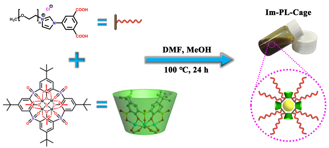 传统固态多孔材料因其在气液固反应中,孔道多被溶剂所占据导致气体难以接触反应活性位点而受到限制,而兼具流动性和多孔性的多孔液体(Porous liquids, PLs)材料则有可能解决此问题。但高性能的多孔液体的制备因其多孔性和流动性的矛盾存在巨大的挑战,尤其是具有本征液态多孔性性的材料。因此有必要发展新型合成手段制备液态多孔材料,使得其保持多孔固体的永久孔隙度,而且具有液体的流动性,提高气体在孔材料中的浓度,改善气体与活性位点的接触,从而增大反应活性。金属-有机配位笼由于其离散的零维骨架结构、可接近的内腔和独特的化学微环境,能够通过富集底物、稳定反应中间体和促进区激活表现出高效的催化能力和选择性。众所周知,聚乙二醇和咪唑鎓盐一般是液态试剂,利用这些官能团对金属-有机配位笼进行功能化修饰有望降低其熔点使其液化从而得到本征多孔液体。
