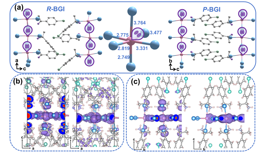 3. (a) 具有R-BGI的三个短键和三个长键的扭曲[GeI6]4-八面体,孤对电子的大致位置用紫色表示;沿b轴观察的R-BGI无机成分;沿 a 轴观察的 P-BGI 的无机成分。(b) R-BGI中占据电子态的SHG加权密度(左);R-BGI中未占用电子态的SHG加权密度(右)。(c) P-BGI中占据电子态的SHG加权密度(左);P-BGI中未占据电子态的SHG加权密度(右)。