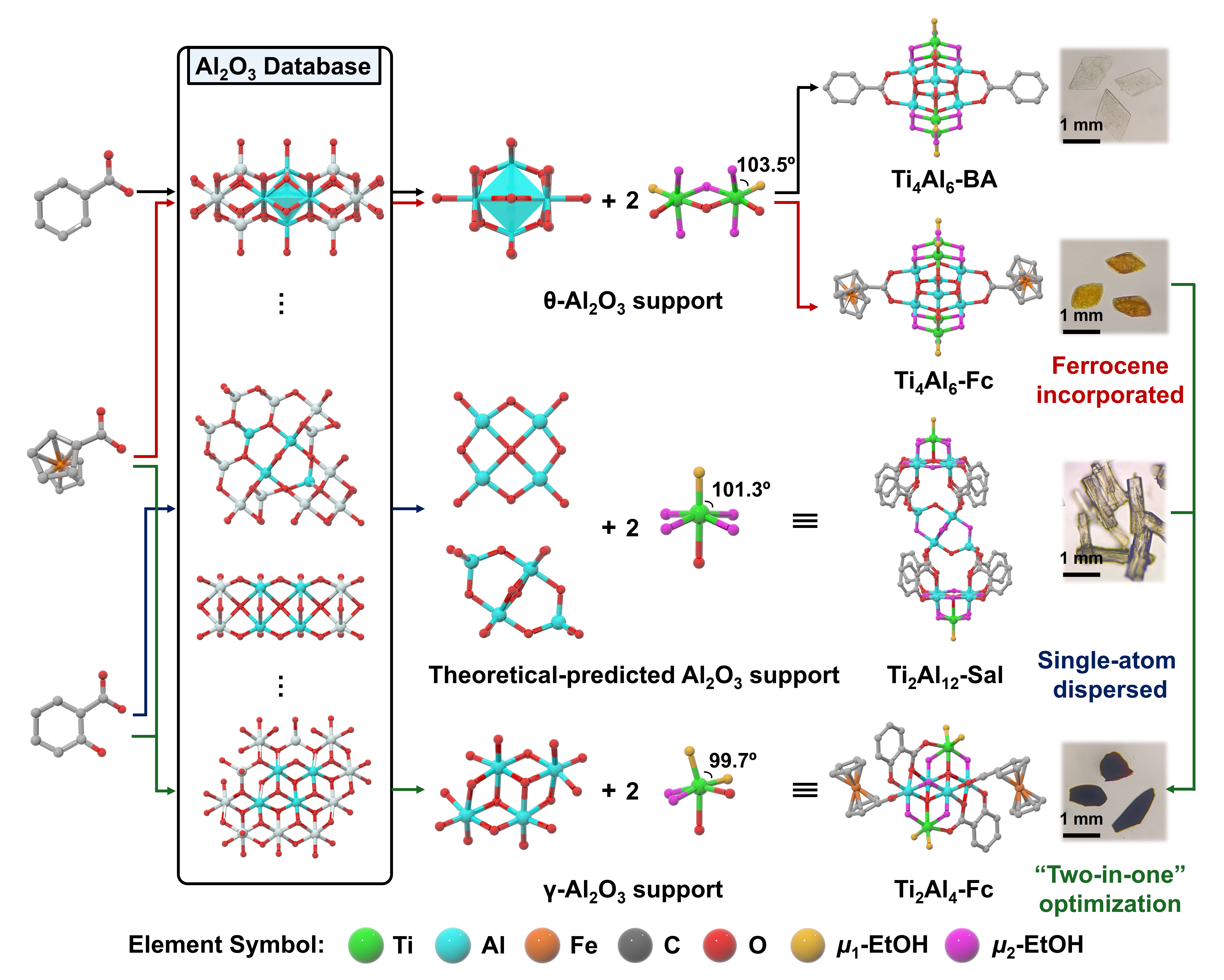 为解决这一问题,中国科学院福建物质结构研究所方伟慧团队和张健团队创新地提出“溶剂放大差异性聚集”策略。通过醇类溶剂的配位延迟作用,充分放大Al3+与Ti4+的聚集动力学差异。在保持Ti4+游离的同时,诱导Al3+优先聚集为铝氧簇(AlOCs)载体,并以末端暴露的钛活性位点形式锚定溶液中游离的钛组分。基于该策略,研究团队成功构筑了结构明确的Ti4Al6簇,其具有类似天然θ-Al2O3的载体结构。进一步研究表明,该类载体平台易于通过后合成修饰进行功能化(如引入二茂铁基团),并可进一步调控以实现钛的单原子分散。最优催化剂Ti2Al4-Fc(具有γ-Al2O3类似结构)在可见光驱动CO2还原反应中,实现了高达2.4 h-1的钛原子周转频率,其性能显著优于许多已报道的钛基光催化剂。本工作为设计原子级分散、高原子利用率的多金属氧簇光催化剂提供了新的范式。