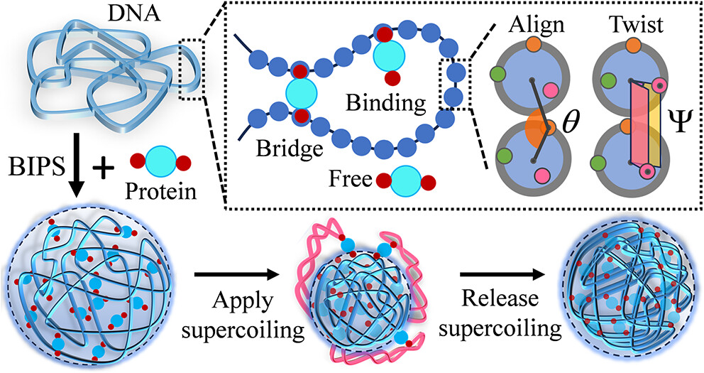在生物大分子体系中,电荷作用、氢键、疏水作用、π–π与阳离子–π等非共价相互作用,决定了蛋白与核酸如何识别、组装并形成生物分子凝聚体。对染色质相关凝聚体而言,这些“相互作用网络”之外还存在一个关键自由度:DNA在转录与拓扑异构酶调控下不断积累/释放扭转载荷,形成DNA超螺旋(supercoiling)。超螺旋不仅可能改变蛋白—DNA的结合几何与多价桥联方式,更可能直接重塑凝聚体的内部结构与尺寸演化路径。