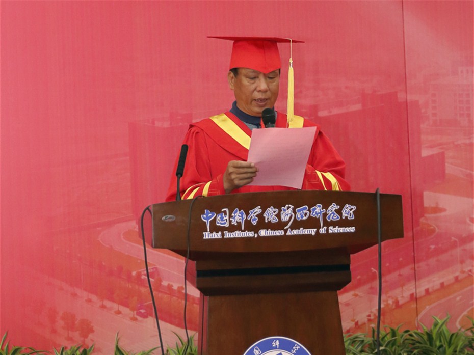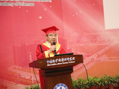 卓著、刘伦杰和梁铭利分别作为博士、硕士和海西联培硕士毕业生代表发言。他们心怀感恩,回忆了在物构所美好生活的点滴,表达了对物构所的依依不舍和对同窗好友的感谢与祝福。其中刘伦杰在发言中说,研究生生活与科研的道路虽然充满酸甜苦辣和艰辛,但他不仅不悔于自己的选择,反而明确了前进的方向,坚定了前行的信心。梁铭利同学用蝉的蛰伏蜕变和争鸣来贴切地形容求学生涯的不同阶段,既生动形象又富含哲理,引人深思。