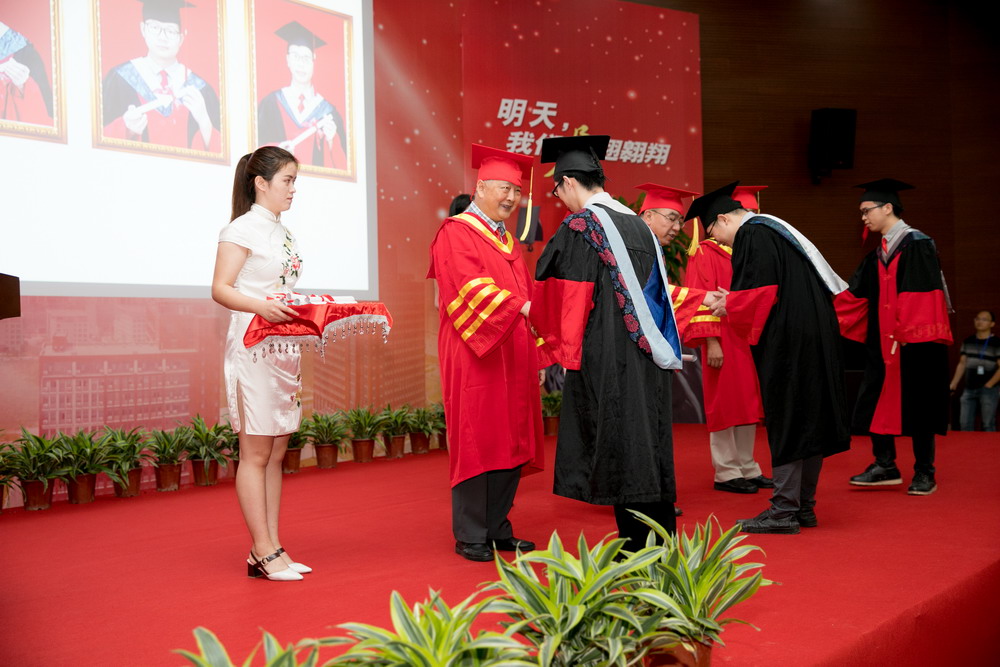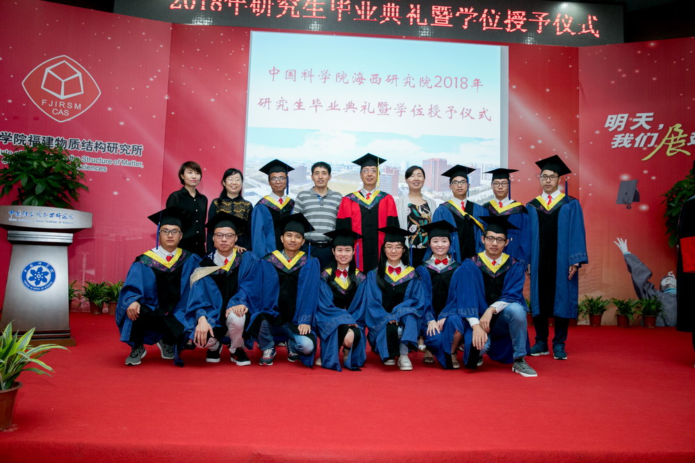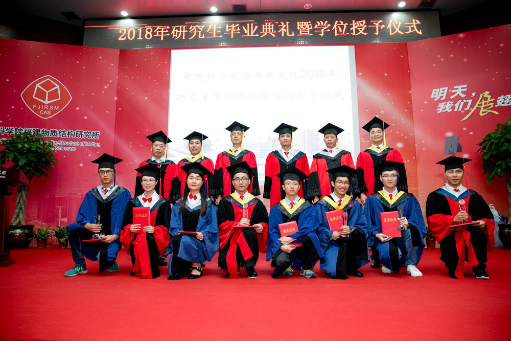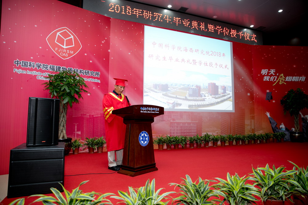 洪茂椿院士宣读了《中科院福建物质结构研究所学位委员会关于授予博(硕)士学位的决定》;吴新涛院士、洪茂椿院士和曹荣为获得学位的同学们授予证书并为他们扶正流苏;卢灿忠宣读了2018届优秀毕业生奖学金获得者名单,领导们为获奖的同学们颁发了奖杯和证书。