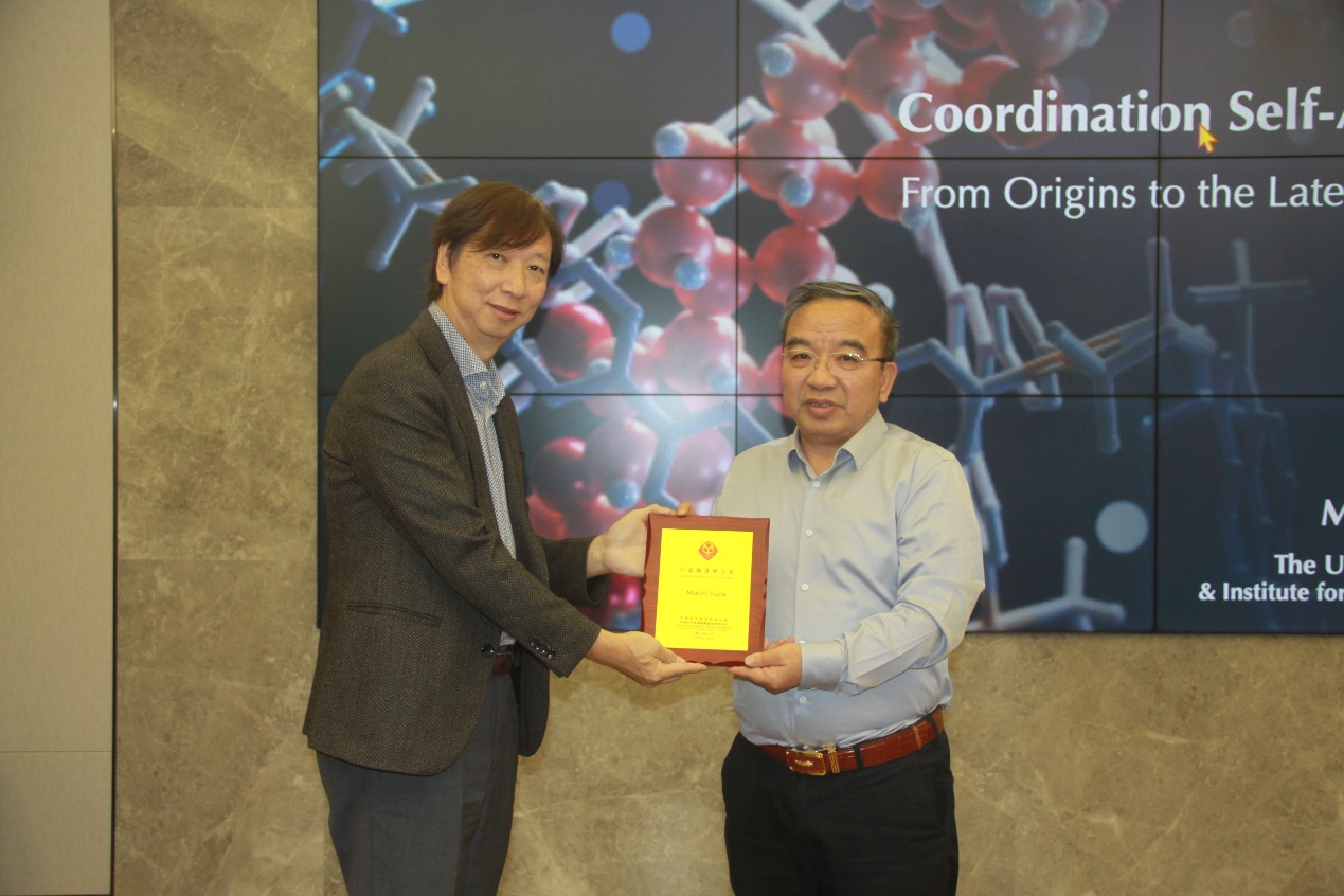 曹荣(右)为Makoto Fujita院士(左)颁发“卢嘉锡讲座专家”荣誉纪念牌