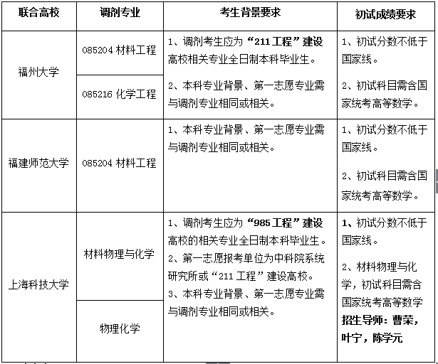 一.中科院海西研究院(福建物构所)与高校联合招收研究生拟接收以下专业调剂生,具体要求如下: