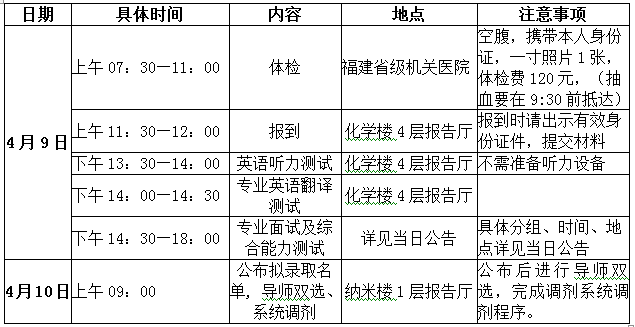 4月初福州最低气温为10℃左右,最高气温在30度左右,气温变化较大。请外地考生特别是北方考生根据福州气温状况带好衣物,避免复试期间身体不适。