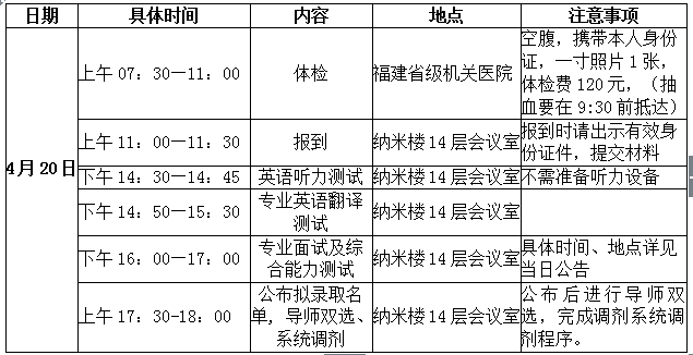 4月初福州最低气温为10℃左右,最高气温在30度左右,气温变化较大。请外地考生特别是北方考生根据福州气温状况带好衣物,避免复试期间身体不适。